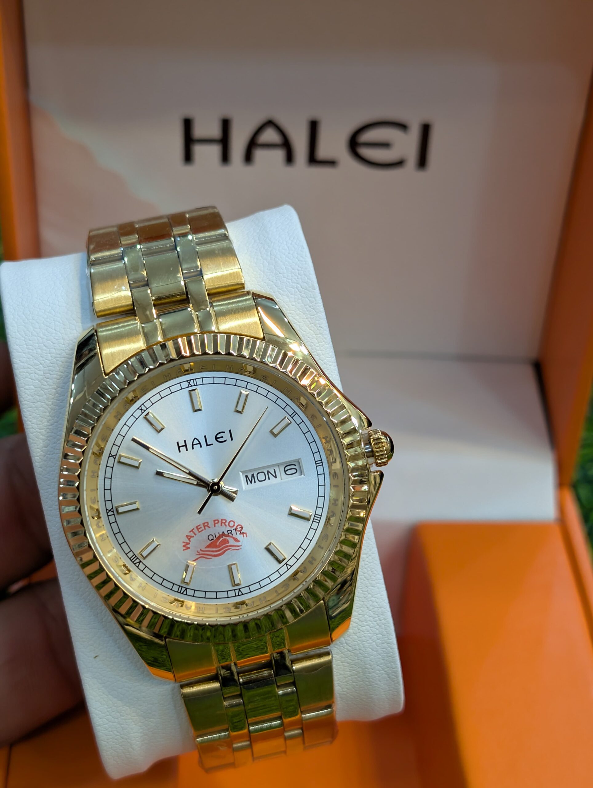 Premium Halei wristwatch featuring a stainless steel waterproof design, elegant finish, and reliable day-date display. Comes with a secure and stylish locking mechanism for everyday durability and comfort. A perfect blend of utility and elegance.