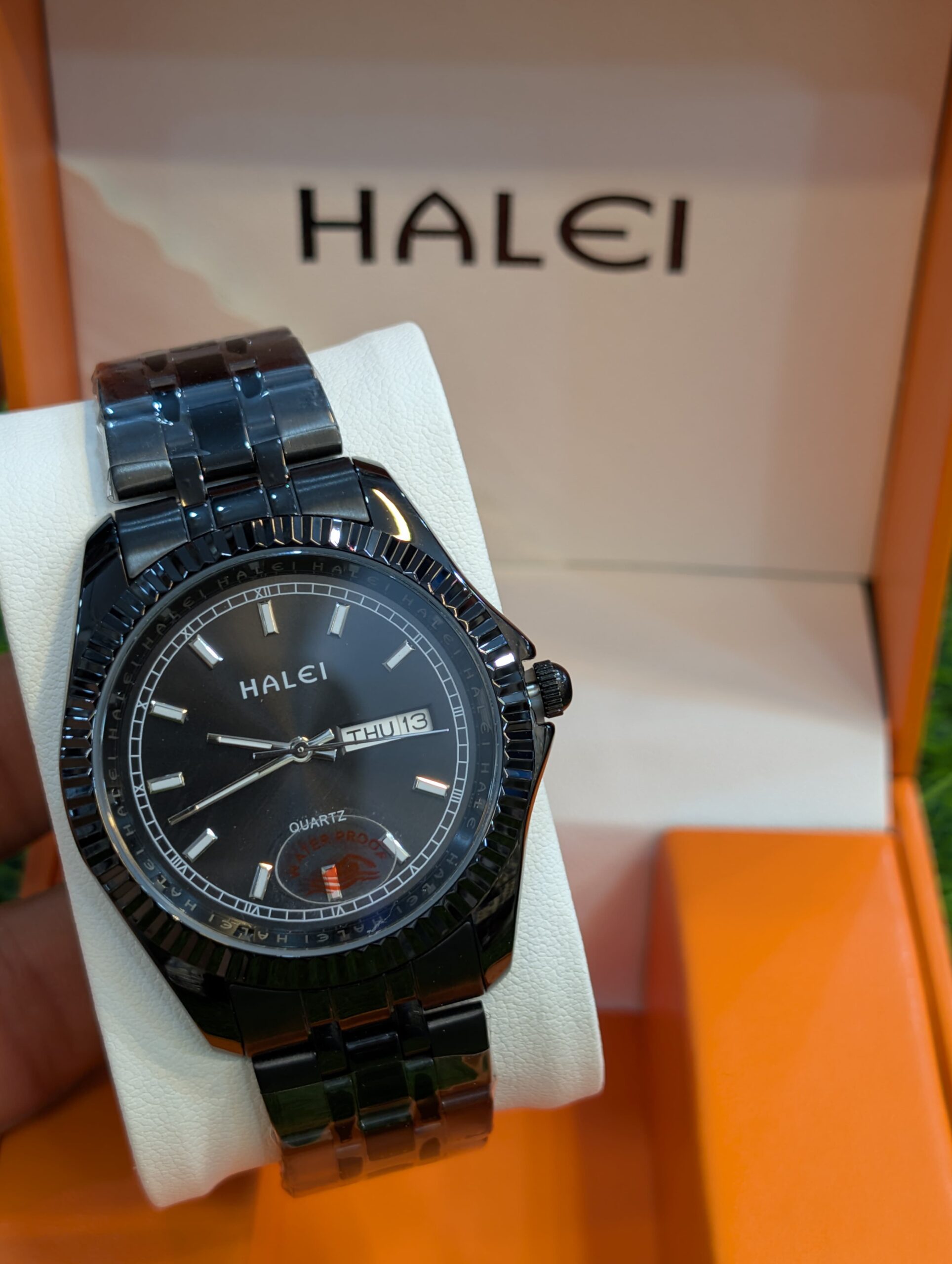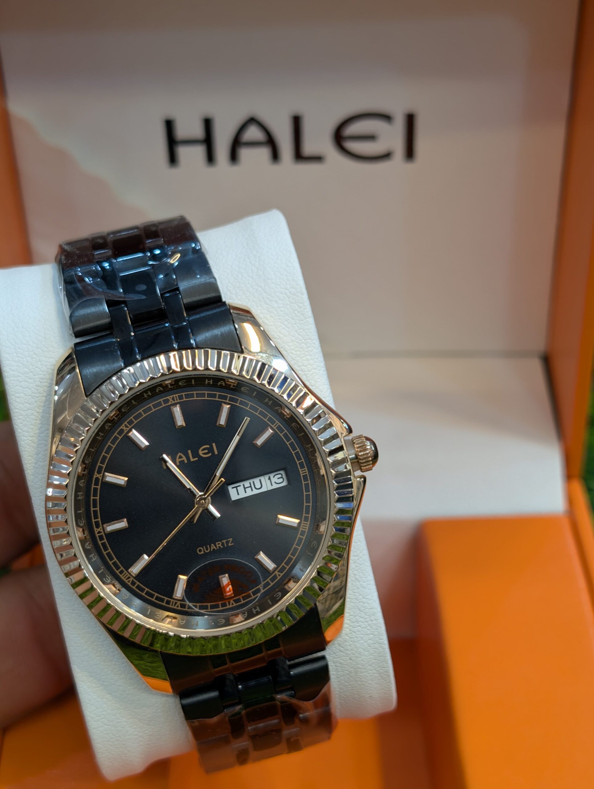 Premium Halei wristwatch featuring a stainless steel waterproof design, elegant finish, and reliable day-date display. Comes with a secure and stylish locking mechanism for everyday durability and comfort. A perfect blend of utility and elegance.