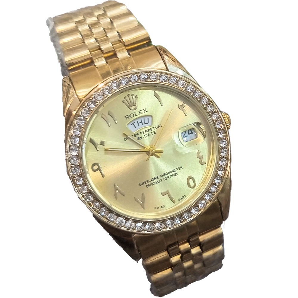Rolex Gold Chain Gold Dial Arabic Number Day and Date Watch