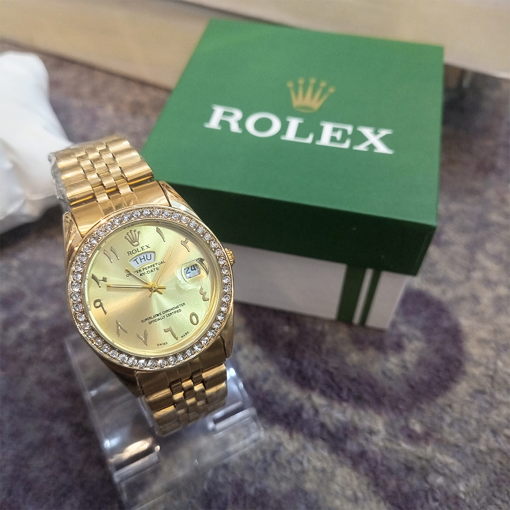 Category: ROLEX Tags: Arabic Numeral Watch, Day and Date Watch, Fold Over Clasp Watch, Gold Chain Watch, Gold Dial Watch, Lightweight Watch, Premium Watch, Quartz Movement Watch, Rolex watch