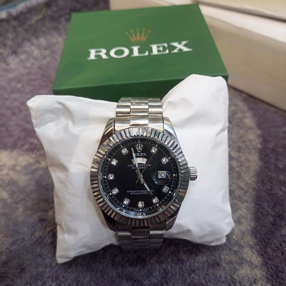 Category: ROLEX Tags: Black Dial Watch, Classic Rolex Watch, Day Date Watch, Elegant Watch, Rolex Clasp Watch, Rolex watch, Silver Chain Watch, Stone dial watch, Stylish men's watch Brand: ROLEX