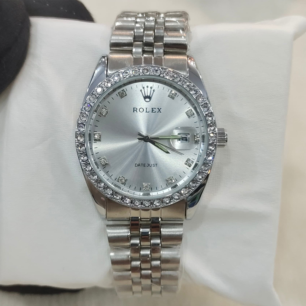 Elegant and lightweight Rolex watch featuring a silver chain, silver dial with sparkling stone markers, date display, quartz movement, and a strong fold over clasp for daily comfort.