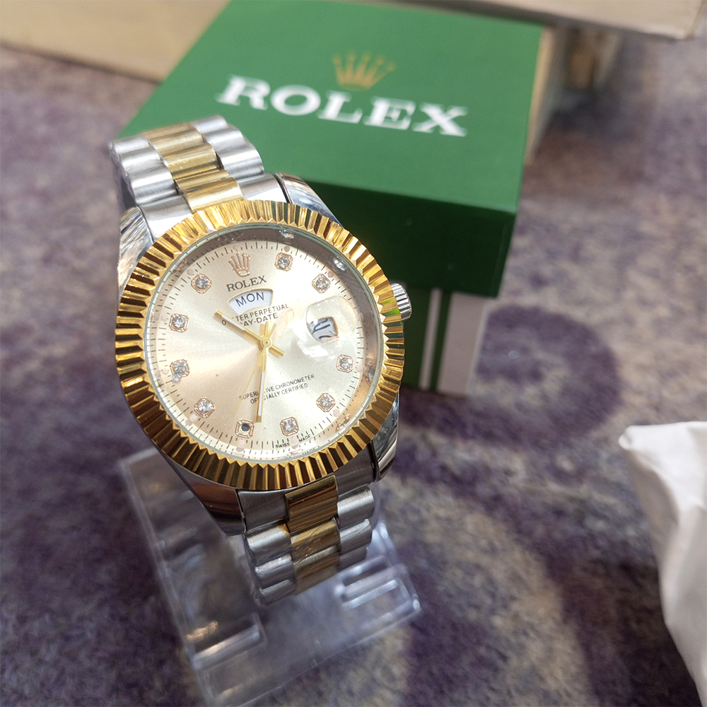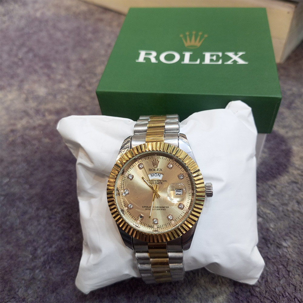 Stylish Rolex watch with a two-tone silver and gold chain, gold dial accented with stone markers, distinctive round cut bezel design, day and date display, reliable quartz movement, and a Rolex logo push clasp for smooth fastening.